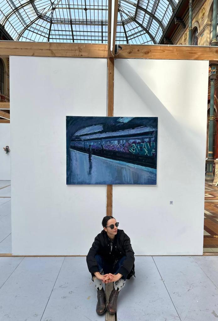 Beaux-Arts de Paris, Quai Malaquais, an October afternoon unfolds as storm Benjamin fills the air with wind and rain. The Seine moves fast and the streets below are almost empty. Inside the large studio where Daria is waiting for me, the sound and atmosphere change. It becomes slower, softer, like breathing. Dozens of easels stand across the open floor, each a small universe of its own. Her table is covered with sketches and jars of brushes. The air smells of turpentine and paint. On the wall, a canvas shows her little sister and their dog sleeping in the Kyiv metro, under a sky of blue, indigo, and darkness. “I didn’t want to paint the war,” she says. “Only the waiting. The not knowing when morning will come.” She pours me a cup of tea, I open my notebook, and we begin to talk.